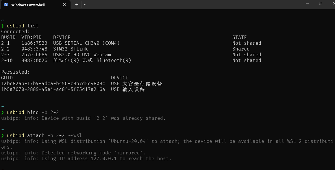 1 | usbipd list // 查看usb列表 |