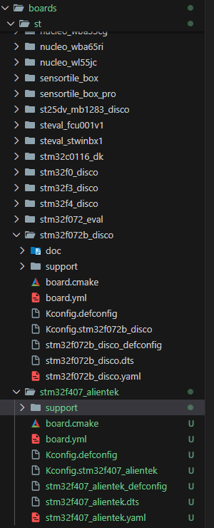 打开zephyr源码路径下boards/st, 从stm32f072b_disco拷贝到新建文件夹stm32f407_alientek, 且将几个文件修改为和文件夹名一致, 参考下面